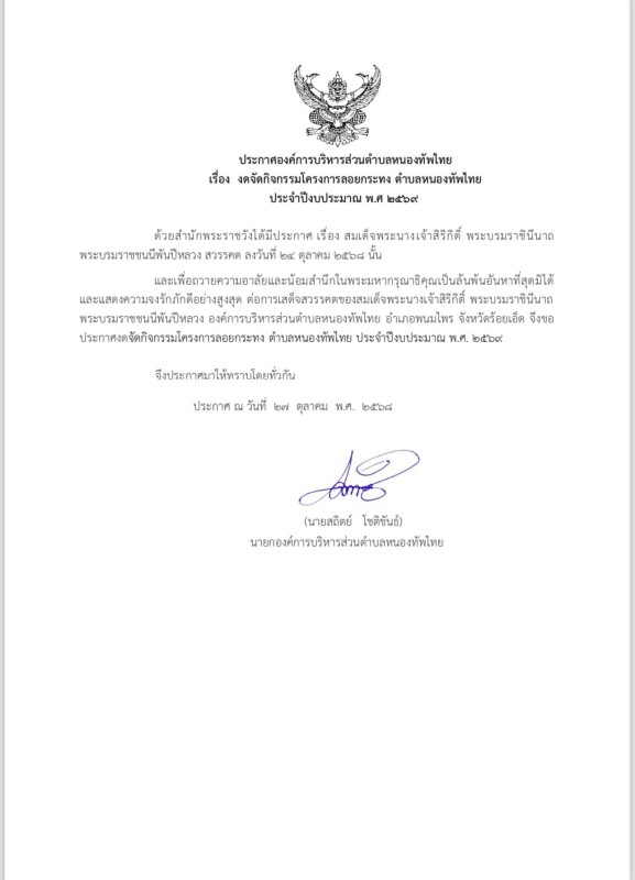 หัวข้อ :: ประกาศแจ้งงดจัดกิจกรรมโครงการลอยกระทงตำบลหนองทัพไทย ประจำปี 2568