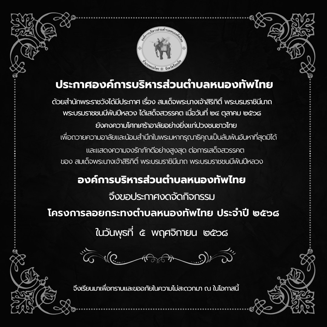 จึงขอประกาศงดจัดกิจกรรมโครงการลอยกระทงตำบลหนองทัพไทย ประจำปี 2568